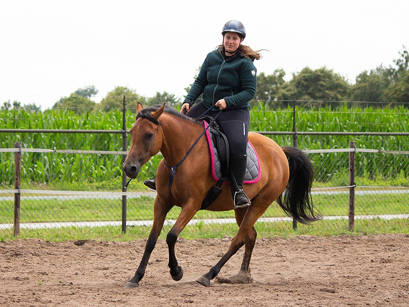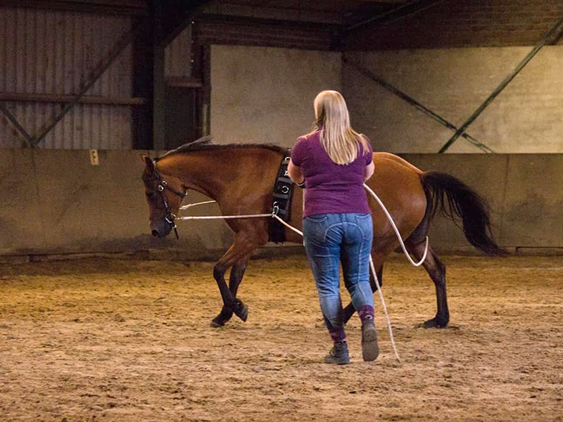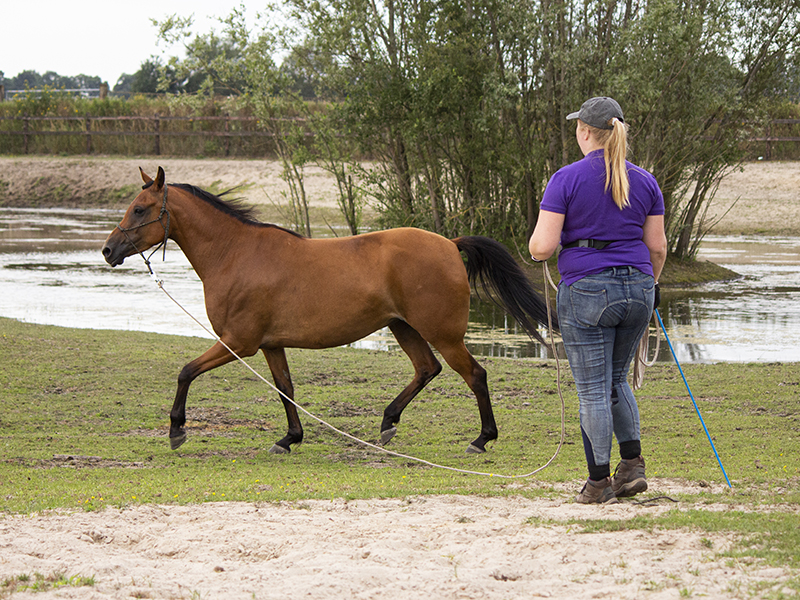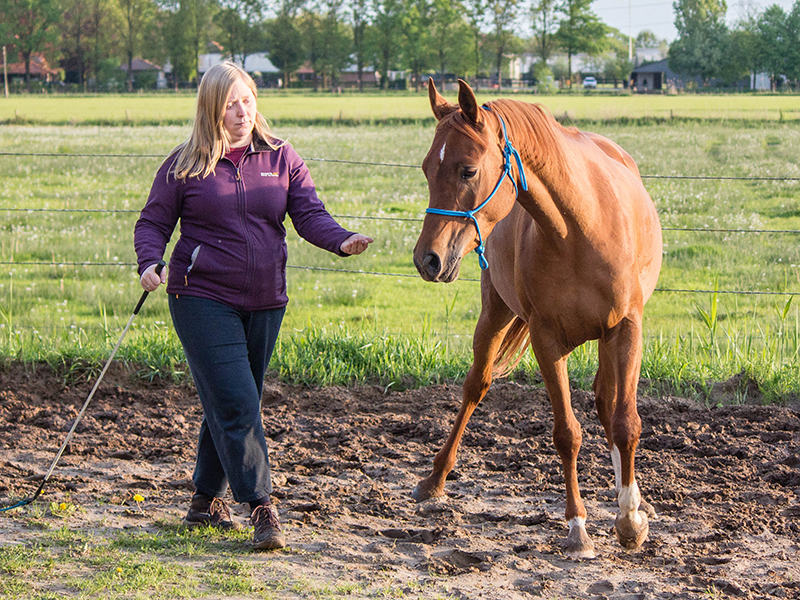 Of je nou een jong paard hebt wat nog nooit gelongeerd is, een paard wat stilstaat als je hem de cirkel op stuurt, een paard dat geen rem heeft bij het longeren, dat zijn lichaam niet goed gebruikt, of een paard wat moeite heeft met zijn balans… er kunnen allerlei redenen zijn waarom je op zoek bent naar longeerles. Eline kan je leren welke hulpen te gebruiken, in welke positie te staan en hoe je kunt zien of je paard in balans loopt. Je leert een paard correct te longeren zonder het gebruik van hulpteugels. Longeren kan met één lijn, maar ook met twee lijnen: de dubbele lange lijnen.