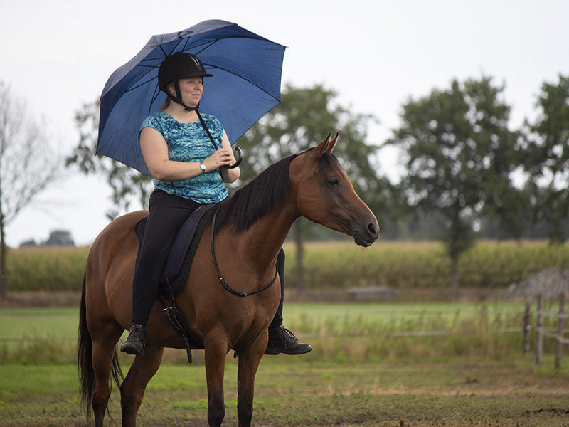 Bij schriktraining van Eline leer je niet alleen om verschillende individuele lastige prikkels te trotseren met je paard, maar ook hoe je je paard kunt leren beter met spannende situaties in het algemeen om te gaan, zodat hij ook op buitenrit of op wandeling, en überhaupt in het dagelijks leven, minder stress ervaart.